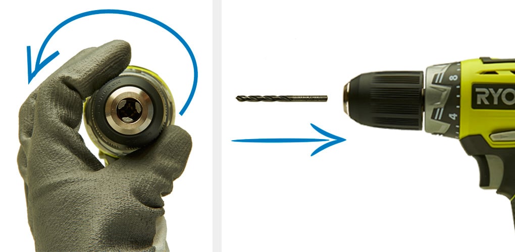 插入位- 该钻头有一个无钥匙的Chuck,因此请锁定工具,然后将Chuck顺时针旋转以打开它。然后插入您选择的位,然后逆时针转动,直到Chuck牢固地固定了位。