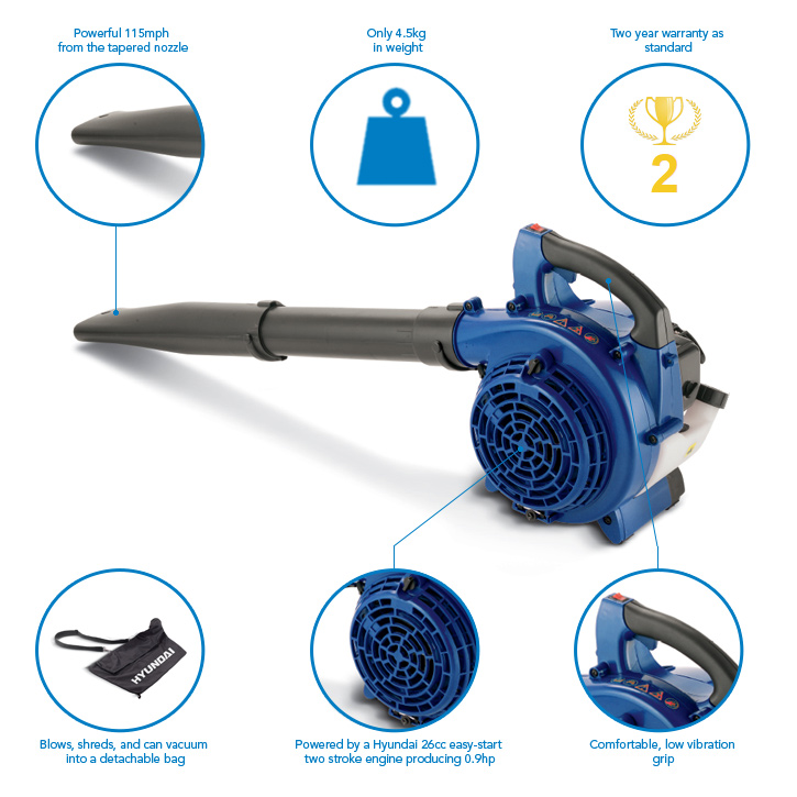 我们的现代HYBV26 26cc吹叶机/碎纸机/真空吸尘器是清理花园的好方法。有了这个功能强大、用途广泛的工具,你可以选择把树叶和碎片吹成整齐的堆,然后捡起来,或者你可以用真空应用程序收集它们。与用耙子手动做这个相比,它不会花你任何时间;记住,当叶子比较干燥时,这是最有效的。或者,我们的任何剪草机也可以用来作为一种快速收集你的草叶子的方法。现代HYBV26概述: